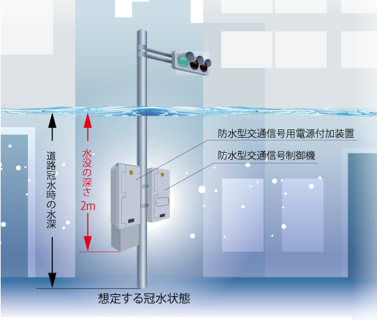 本装置は筐体の防水性能を高めることで、河川の氾濫などによる道路の冠水で水没しても、交通信号制御機の故障を防ぎます。